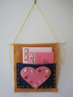 - Sew the heart onto the piece of felt that will become the pocket with the yarn. The pocket will be